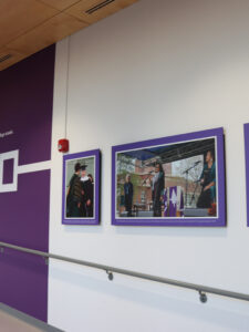 At the heart of the display is a bold image of the Haudenosaunee flag, easily visible from outside the building. Surrounding it are photos of students learning about and caring for the earth, as well as the shared moments of connection between members of the Onondaga Nation and the Le Moyne community.