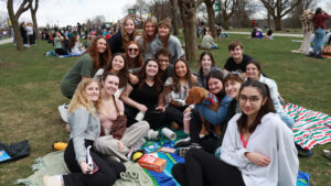 Emma Gross ’26 (in the white sweater) talks with President Linda LeMura during the solar eclipse.