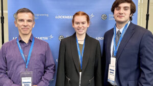 Lindsey Bush ‘23 (physics with civil engineering concentration) and Nicholas Carinci ‘23 (physics with mechanical and aerospace engineering concentration), accompanied by faculty advisor Dr. Stamatios Kyrkos, reached the final eight stage in a competition that started with 71 participating colleges and universities. The Air Force Academy prevailed in the quarter final round, and went on to win the competition. The eight quarter-finalists were recognized and given prizes during the award ceremony at the end of the competition.